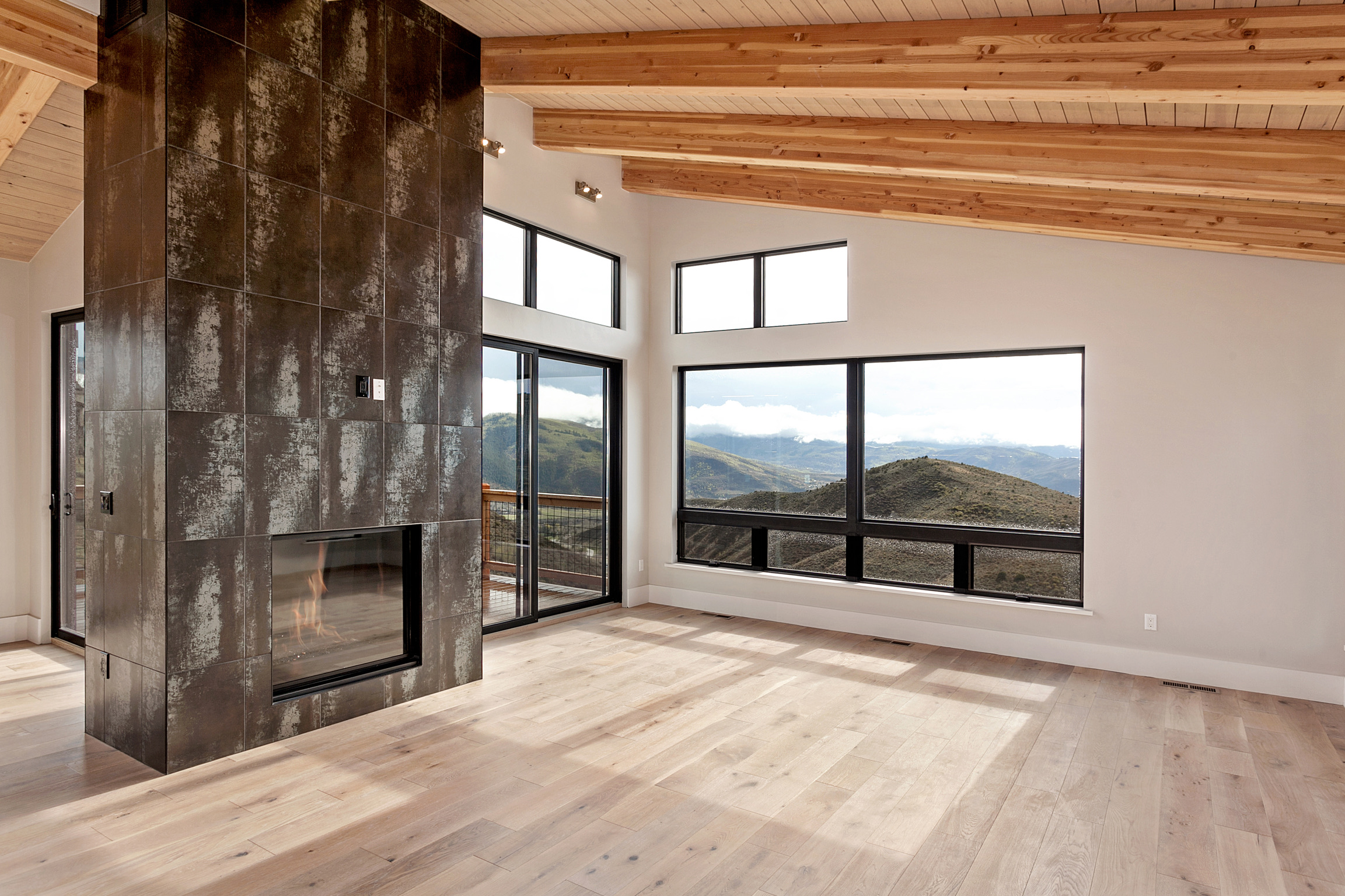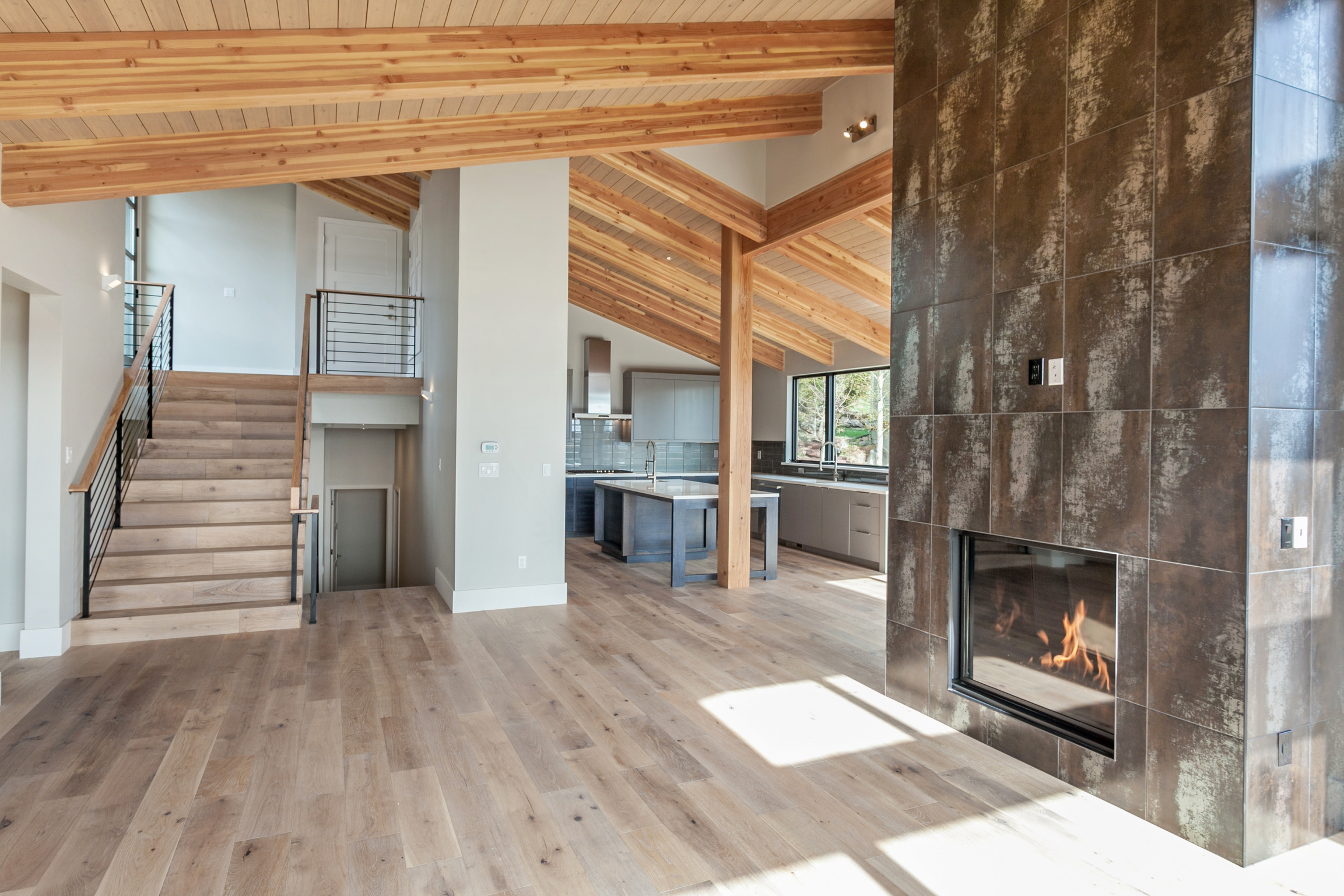 Oak floors and modern tile around the fireplace create a contextually relevant interior design to the structure.