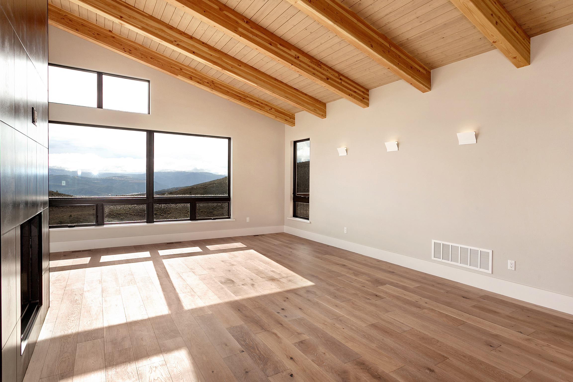 Natural light floods the open living with accents of wood beams and warm wood T&G ceiling.