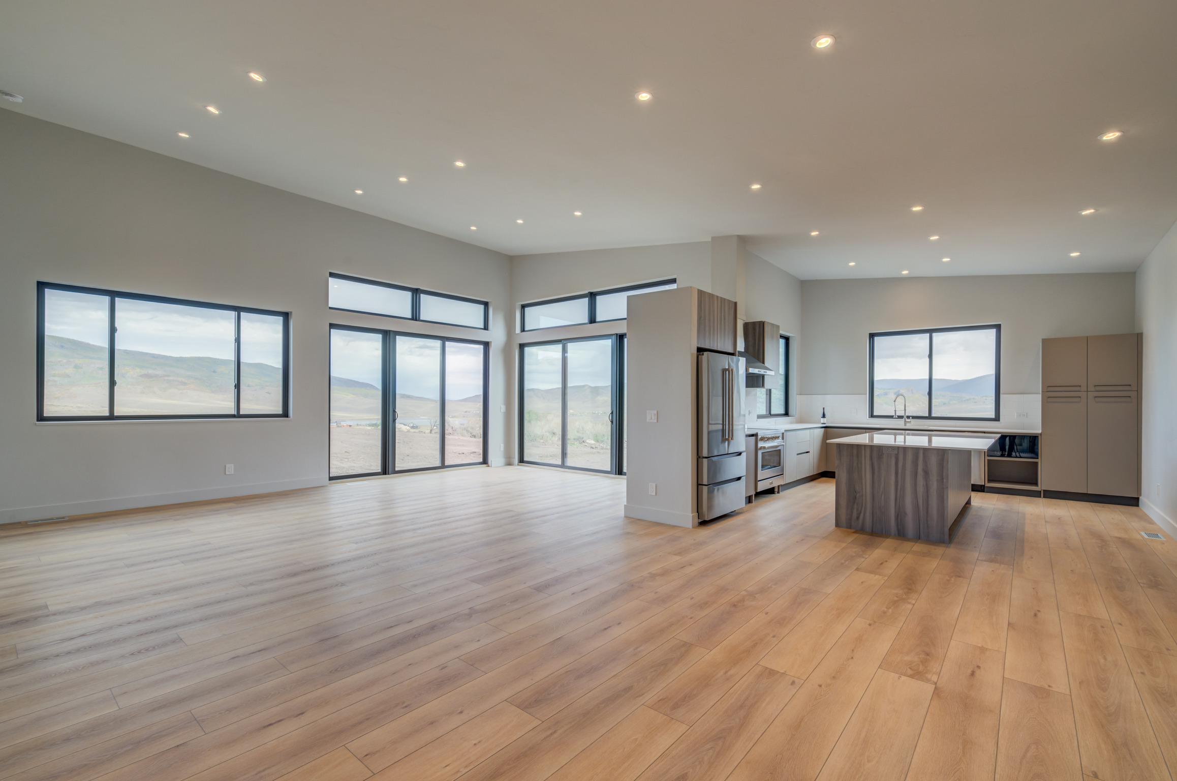 From the ridge, each oversized window was strategically placed to picture frame the adjacent ski runs, jagged peaks, and lake views.
